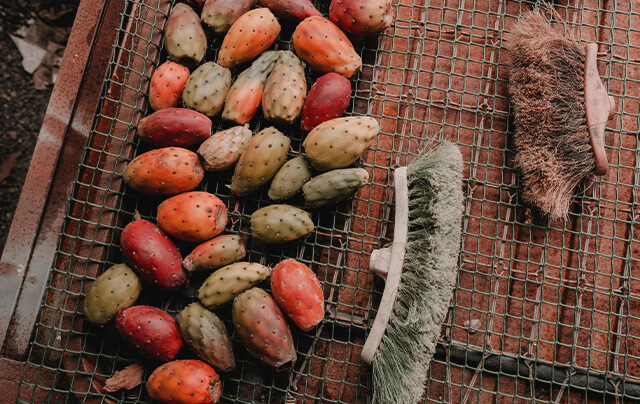 La production d’huile de pépins de figue de Barbarie commence évidemment par la cueillette du fruit. Cette première opération est très délicate, elle nécessite beaucoup de patience et de savoir-faire. Il existe 3 types de cueillette selon la maturité du fruit (qui se reconnaît à sa couleur) : au bâton, à la main ou au couteau. Plus le fruit est mûr, plus il est fragile et demande une attention particulière et donc une cueillette à la main.